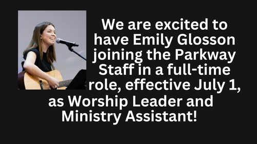 So, after a short break following the school year, Emily will begin her full-time ministry with Parkway on July 1! Her new role will involve expanding the scope of her worship duties, including leading in other ministries beyond Sunday mornings and overseeing the sound and tech ministry. Beyond leading worship, she will also be serving in our College, Kids, and Social Media/Communications ministries in a variety of ways, working the church office front desk two days per week, and assisting the me as needed with various other aspects of ministry. I am really looking forward to Emily bringing her teaching experience in public and private elementary schools, her leadership experience with Breakaway Ministries and Aggies Sisters for Christ, and especially the many gifts that the Holy Spirit has given her for this expanded role within our church family. She will serve alongside me as we continue to join with all of you to Love God and Love People. Our sincere hope is that God continues to grow Parkway and work though us all to reach current and future generations with the Good News of The Way of Jesus!